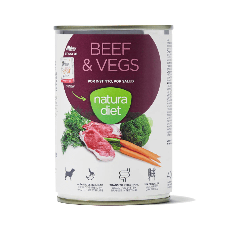 Natura Diet Beef & Vegs es un alimento húmedo completo, natural y altamente proteico para perros adultos. Su receta con un 83% de carnes frescas (pollo y vacuno), combinadas con vegetales y aceites naturales, está biológicamente adaptada para brindar energía, sabor y salud en cada comida.